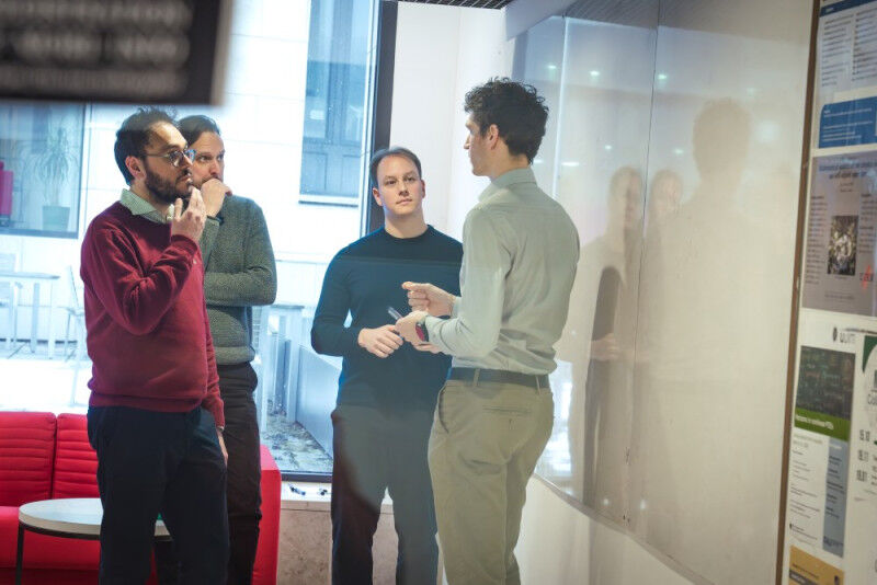 ISTA scientists achieve algorithmic innovation in the genetic analysis of complex traits. Left to right: Marco Mondelli, Matthew Robinson, Al Depope, and Jakub Bajzik. © ISTA