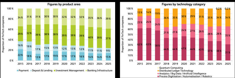 At business division level, infrastructure became the largest product segment for the first time, ahead of investment management (see Figure 2, left chart). This underlines the trend of FinTech companies providing technological foundations for established financial institutions.