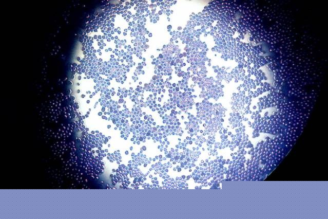 Oval Saccharomyces cerevisiae yeast cells magnified by 400 times.