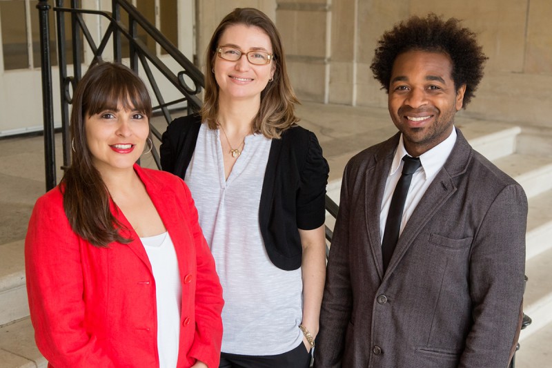 University of Illinois kinesiology and community health Andiara Schwingel’s studies show that health-promotion programs may be more successful at reaching older Latinas in the U.S. if they incorporate the religious and spiritual values that tend to be important to these women. Shown with Schwingel, center, are her co-authors, left, doctoral student Patricia Gálvez and post-doctoral research fellow Emerson Sebastião. Alumna Deborah Linares also was a co-author on the studies. Photo by L. Brian Stauffer