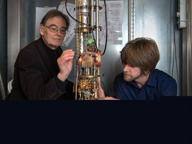 Erwin Schuberth (TUM) and Marc Tippmann (TUM) with a high performance cryostate at the Walther-Meissner-Institut - Photo: Andreas Battenberg / TUM