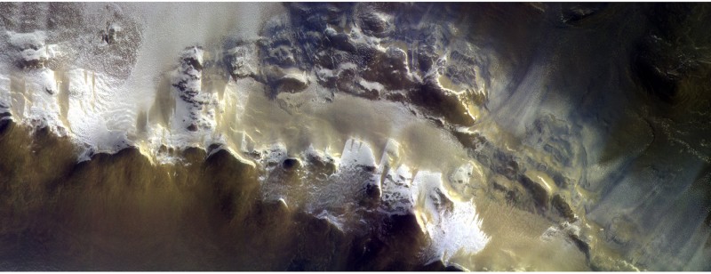 Image from the rim of Korolev crater (165.9 E, 73.3 N) at 5.08 m/px with a ground-track velocity of 2.90 km/s. The solar incidence angle was 76.6 deg at a local solar time of 07:14:11. © ESA / Roscosmos / CaSSIS
