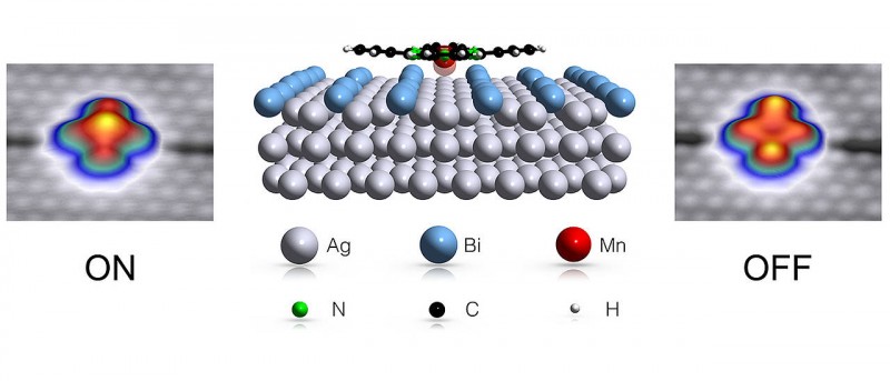 11/14/2018 - For the first time, physicists from the University of Würzburg have successfully positioned an organic molecule on a substrate realizing two stable configurations. This may have application potential in molecular spintronics. It looks like a cross with four arms of equal length that have a central atom at their intersection. All atoms are arranged in one plane so that the molecule is absolutely planar - at least in the normal state. Physicists from the University of Würzburg have now succeeded in manipulating this molecule using a special deposit and an electrical field to permanently take on two different states. This could make the molecule suitable as a kind of "molecular switch" for spintronics applications - a trailblazing data processing technology based on electron spin. The molecular switch is the fruit of a collaboration of members from the Departments of Experimental and Theoretical Physics at the University of Würzburg: Dr. Jens Kügel, a postdoc at the Department of Experimental Physics II, devised and ran the experiments.