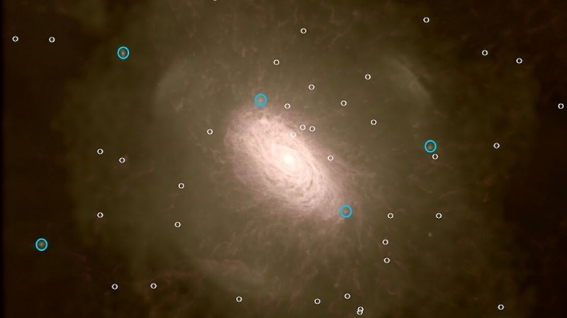 Bright galaxies (blue) and dim dwarf galaxies (white) orbiting a simulated galaxy’s center.