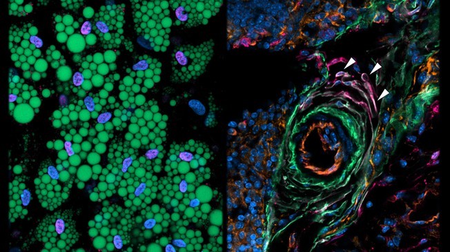 A study led by researchers in Switzerland has revealed a new cell type that resides in the body's fat depots where it can actively suppress fat cell formation. This discovery was made using single-cell transcriptomics and opens entirely new avenues to combat obesity and related diseases such as diabetes. Image: Two different aspects of fat: left, mature human fat cells grown in a Petri dish (green: lipid droplets); right, a section of mouse fat tissue with in the middle, a blood vessel (red circle) surrounded by Aregs (arrows), newly discovered cells capable of suppressing adipogenesis (credit: B. Deplancke/EPFL). Fat cells, or adipocytes, are at the center of nutritional and metabolic balance. Adipogenesis - the formation of mature fat cells from their precursor cells - has been linked to obesity and related health problems such as cardiovascular disease and type-2 diabetes. However, it has proven very challenging to determine the identity and molecular properties of fat cell precursors. This is because, next to adipocytes and blood cells, fat tissue contains a large number of stromal cells that are difficult to distinguish using traditional approaches such as genetic labeling.