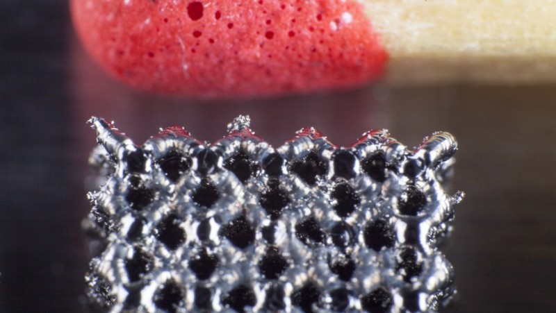Additive Manufacturing enables minuscule metal structures with a complex geometry to be produced. Here is a test piece compared with a match head. Using AI to monitor the manufacturing process acoustically guarantees that the workpiece is devoid of any interior defects. Image: Empa