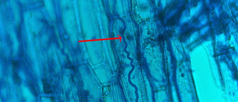 Usually, an infection with Epichloë fungi does not affect the appearance of the plant. The red arrow points to an Epichloë hypha between plant cells. (Image: Jochen Krauss)
