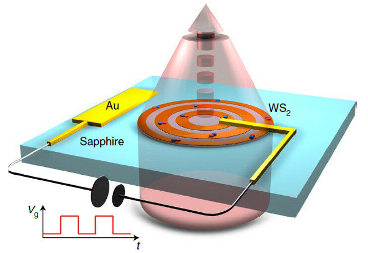 Schematic drawing of an atomically-thin lens (brown rings) on glass (blue) that effectively focuses light above the surface. The focusing mechanism can be turned on and off using a small electrical voltage. Image from the publication.