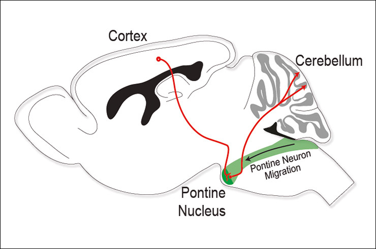 The corticocerebellar pathway - In a comprehensive study, researchers from the Rijli group found that a single Hox transcription factor expressed in a group of neurons of the pontine nucleus - the cerebral cortex most important brainstem relay to the cerebellum - determines the wiring onto these neurons of somatosensory cortical neurons, while avoiding visual cortical neurons. These findings further our understanding of the molecular logic underlying complex corticocerebellar circuit assembly. As the foundation for our brain is laid, 100 billion neurons are formed and appropriately connected. Soon after the neurons are born, they begin their migration to their final location in the brain - sometimes very far away from their birthplace - where they start establishing connections with other neurons. Together, these connections create neural circuits along which the information will travel. Coordination among these processes is critical, especially when distant brain structures need to be orderly connected through intermediate structures. The mammalian corticocerebellar pathway is one such long-distant circuit and it has a fundamental role in sensorimotor coordination and learning.