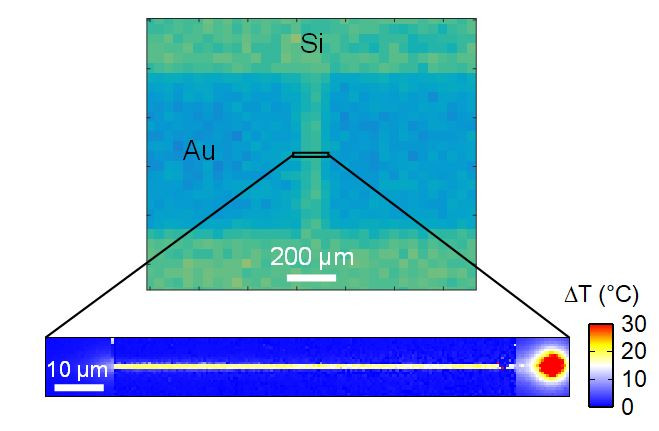 Temperature map of a gold nanowire on a silicon substrate, Joule-heated by the application of an electrical current of 7 mA, obtained through infrared thermography ( top ) and a spin-crossover surface thermometer ( bottom ). While heating remains undetectable in infrared due to low thermal and spatial resolution, temperature distribution is well resolved using an SCO-based thermometer, which reveals a 'hot spot' resulting from a malfunction of the component. Ridier et al. Scientists from the Coordination Chemistry Laboratory and Laboratory for Analysis and Architecture of Systems, both of the CNRS, recently developed molecular films that can measure the operating temperature of electronic components on a nanometric scale. These patented temperature-sensitive molecules have the distinctive quality of being extremely stable, even after millions of uses. They were presented in an article published on 17 July 2020, and could soon be deployed in the microelectronics industry. The miniaturisation of electronic components coupled with their increasing integration density has considerably expanded heat flows, which can lead to overheating.