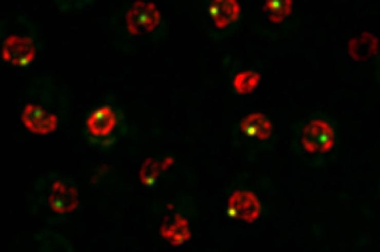Representative image of a GFP-tagged chromosomal locus near an inducible double strand break in S.cerevisiae. The nuclear periphery is visualized using a nuclear pore marker.