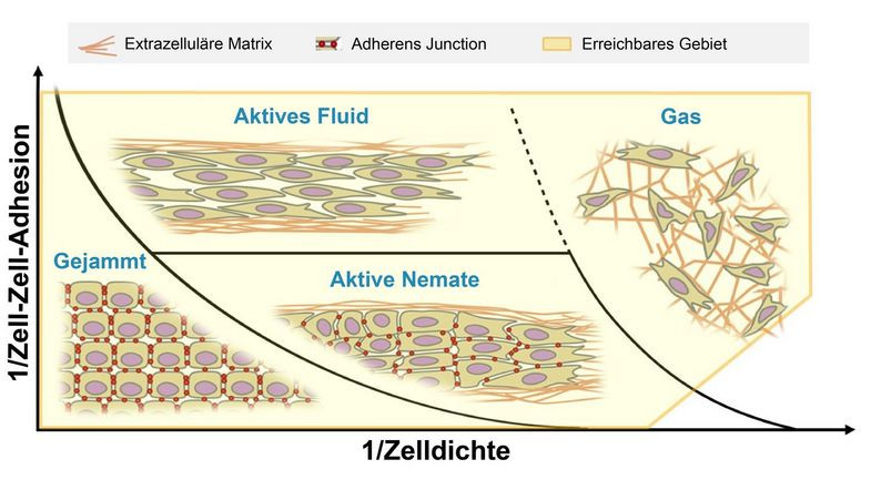 Schematic representation of different types of movement of tumour tissue in the extracellular matrix. Image: Peter Friedl, Stefano Zappen, Andreas Deutsch, Josef A. Käs, Jürgen Lippoldt In cooperation with colleagues from Germany, Italy and the Netherlands, researchers at Leipzig University have investigated the structure of tumour tissue and the behaviour of tumour cells in detail, gaining important insights that could improve cancer diagnosis and therapy in the future. They found out that during tumour development the way cells move can change from coordinated and collective to individual and chaotic behaviour. They have just published their research findings in the journal "Nature Cell Biology". The paper was supervised by tumour biologist Professor Peter Friedl of Radboud University in Nijmegen, the Netherlands, in cooperation with the research groups headed by Professor Josef A. Käs (Leipzig University), Professor Andreas Deutsch (TU Dresden) and Professor Stefano Zapperi (University of Milan). The scientists studied biological changes that cells usually undergo as cancer develops. The most typical of these is the degradation of the epithelial adhesion molecule E-cadherin.