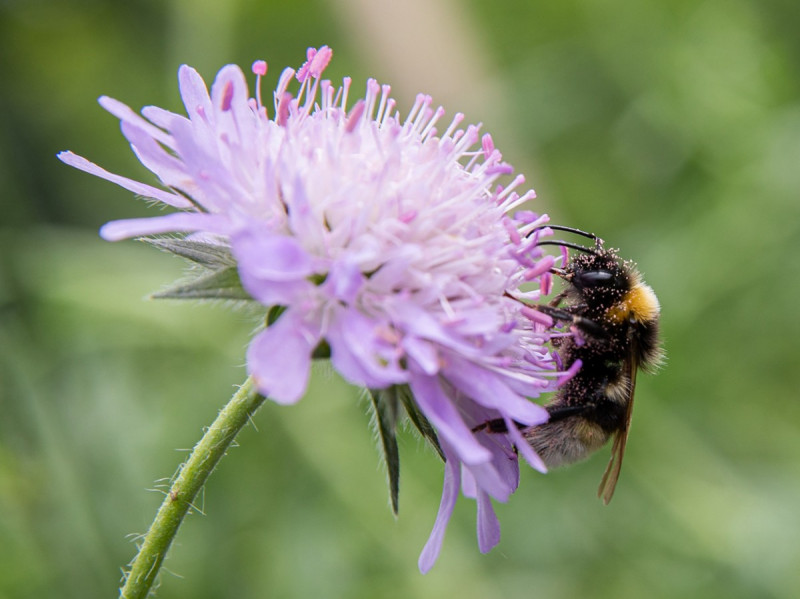 A bumblebee covered with pollen grains samples a field scabious.© WWU - Peter Leßmann