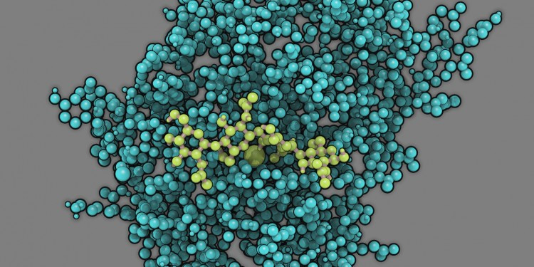 Model of the enzyme chitosan deacetylase (turquoise) with its substrate chitosan (light green) bound in its active site