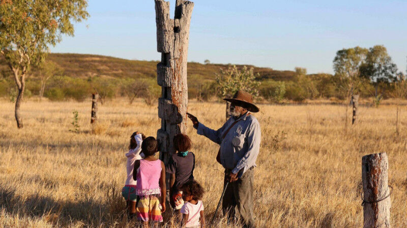 Ronnie Wavehill talking to his grandchildren about the early colonial days in his first language Gurindji. Photo: Brenda L Croft 2015.