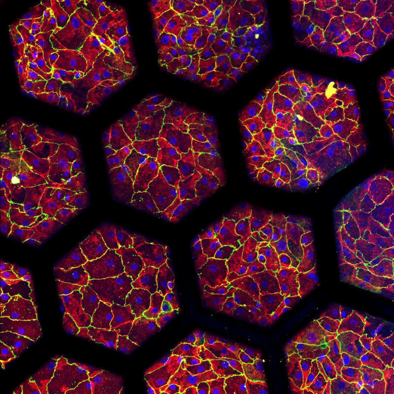 Immunostaining of patients cell cultures on a second-generation lung-on-chip. Pauline Zamprogno, ARTORG Center for Biological Engineering Research - In collaboration with clinical partners from the Inselspital, researchers from the ARTORG Center for Biomedical Research of the University of Bern have developed a second-generation lung-on-chip model with life-size dimension alveoli in a stretchable membrane, made of purely biological material. The new model reproduces key aspects of the lung tissue architecture not found in previous lungs-on-chip. This opens up new possibilities for basic pneumological research, understanding lung pathologies, drug screening and precision medicine. The lung is a complex organ whose main function is to exchange gases. It is the largest organ in the human body and plays a key role in the oxygenation of all the organs. Due to its structure, cellular composition and dynamic microenvironment, is difficult to mimic in vitro.