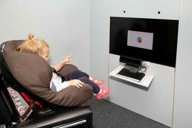 A child listening to a recording as part of the ManyBabies project. The ’listening time’ is calculated by measuring how long the child stares at a neutral stimulus. Photo: Psychology of Language Research Group, University of Göttingen