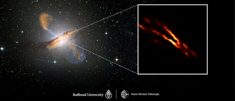 At the centre of Centaurus A is a black hole with the mass of 55 million suns. This is the place where a massive jet is born. (Image: R. Bors; CSIRO/ATNF/I. Feain et al., R. Morganti et al., N. Junkes et al.; ESO/WFI; MPIfR/ESO/APEX/A. Weiß et al.; NASA/CXC/CfA/R. Kraft et al.; TANAMI/C. Müller et al.; EHT/M. Janßen et al.)