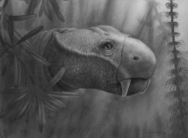 Life reconstruction of the the dicynodont Dicynodon. Aside from the tusks in the upper jaw, most dicynodonts possessed a turtle-like beak that they used to chew their food. Marlene Hill Donnelly