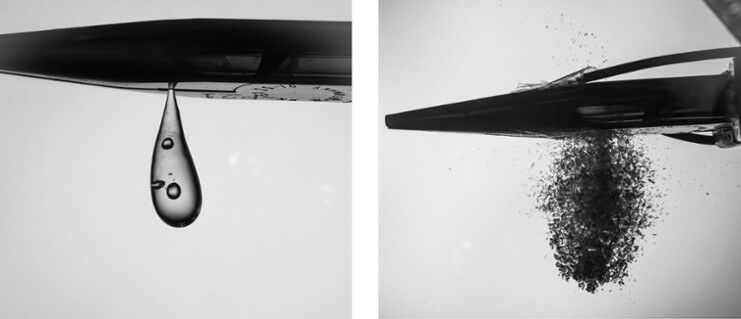 Left: a Price Rupert’s drop. Right: when the tail of the drop is squeezed, it breaks into countless tiny fragments - all roughly the same size. Images: S. Kooij et al., Nature Communications.