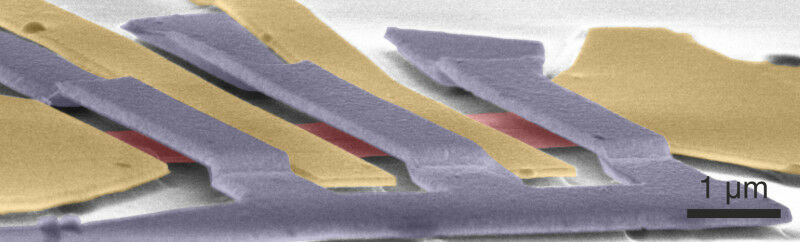 Scanning electron microscope image of a contacted, two-atom-thick, free-floating graphene flake with a free-floating metal bridge hovering above it. Photo: Fabian Geisenhof/Jakob Lenz