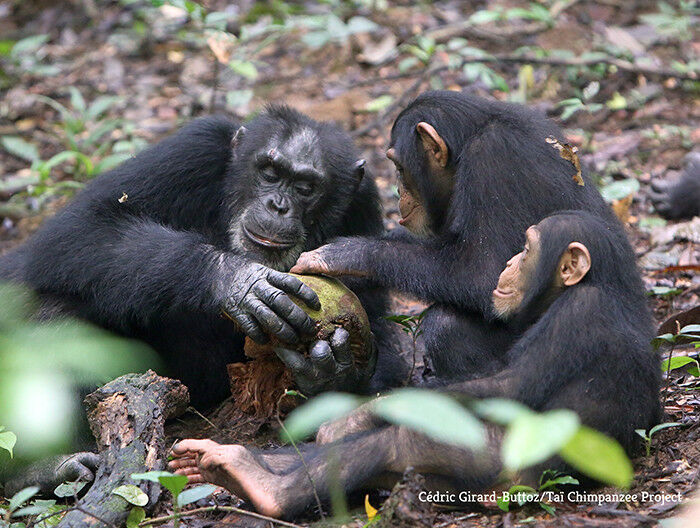 Adult male chimpanzee sharing food with two young orphans. Orphaned young are often adopted, as here by this old male, which may explain why the stress of maternal loss does not persist. Cédric GIRARD-BUTTOZ/TAÏ CHIMPANZEE PROJECT - The loss of a loved one can be a defining moment, even in the animal world. In chimpanzees, for example, individuals whose mothers die when they are young are smaller than their counterparts, reproduce less and are also more likely to die at a young age. But why? To find out, an international research team 1 led by a CNRS researcher 2 studied the shortand long-term effects of maternal loss on the stress levels of orphaned chimpanzees over a 19-year period. By comparing the levels of a stress hormone marker, cortisol, between young and adult orphans and non-orphans, the scientists found that young orphans were highly stressed; however, those who had lost their mothers for more than two years or who were adults at the time of the study were no more stressed than other chimpanzees whose mothers were still alive. This means that they do not suffer from chronic stress, unlike in humans, where children whose mothers die when they are very young are subject to chronic stress throughout their lives.