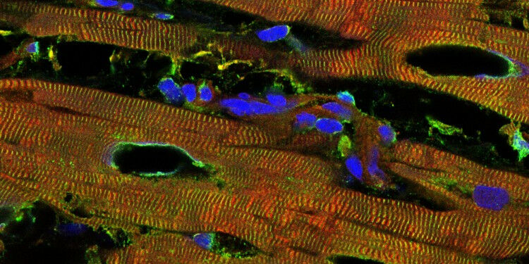 Heart tissue from a patient with chronic heart disease due to dilated cardiomyopathy. Red staining indicates titin, green another protein of the contractile units, and blue the nuclei. The holes are indicative of disease-induced tissue damage.