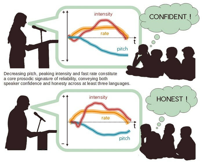 Two types of judgements (certainty, honesty) are based on a single acoustic signature: high pitch that falls at the end of the word, intensity in the middle of the word, and fast speech rate. Above: certainty, below: honesty. Jean-Julien Aucouturier and Louise Goupil, STMS laboratory (CNRS/Ircam/Sorbonne Université/Ministère de la Culture) - Faster speech rate, greater intensity in the middle of the word, and falling pitch at the end of the word: that is the prosody 1 to adopt if one wants to come across as reliable and honest to one's listeners. Scientists from the Science and Technology for Music and Sound laboratory (CNRS/Ircam/Sorbonne Université/Ministère de la Culture) 2 and the Perceptual Systems Laboratory (CNRS/ENS PSL) have conducted a series of experiments 3 to understand how we decide, based on the voice, whether a speaker is honest and confident, or on the contrary dishonest and uncertain. They have also shown that this signature was perceived similarly in a number of languages (French, English, Spanish), and that it is registered "automatically" by the brain: even when participants were not judging the speaker's certainty or honesty, this characteristic sound impacted how they memorized the words. Prosody consequently conveys information on the truth-value or certainty of a proposition. Scientists are now trying to understand how speakers produce such prosody based on their intentions.