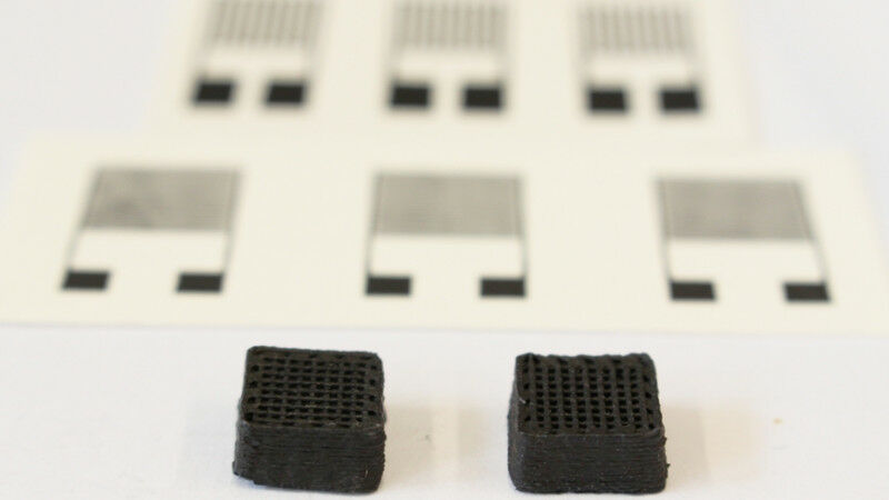 Novel material for printed circuits: Two test cuboids one centimeter wide from the 3D printer. The printed electronic sensors can be seen in the background. Image: Empa - Intelligent packaging with sensors that monitor goods, such as vegetables, on long transport routes is a trend for the future. Yet printed and disposable electronics also cause problems: Metals in printing inks are expensive - and disposing of them in an environmentally sound manner is costly and exacerbates the problem of electronic waste. A new solution from researchers aims to remedy this. More precise, faster, cheaper: Researchers all over the world have been working for years on producing electrical circuits using additive processes such as robotic 3-printing (so-called robocasting) - with great success, but this is now becoming a problem. The metal particles that make such "inks" electrically conductive are exacerbating the problem of electronic waste.