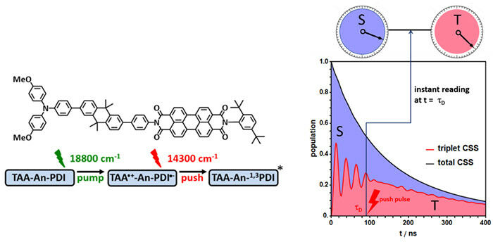Principle sketch of the experiment. The charge-separated radical pair (CSS-RP, black curve) decays in about 1000 nanoseconds by recombination of the electrons to singlet or triplet product. The dynamic change of the CSS radical pair between singlet (S) and triplet (T) is only recorded on average over the total reaction time. Using the push-pull technique, the singlet and triplet character of the CSS radical pair can be read out at any time. (Image: Christoph Lambert / Universität Würzburg) 12/23/2021 - Researchers from Konstanz, Novosibirsk and Würzburg make it possible to read out optically indistinguishable spin states with a new spectroscopy method - published in "Science". The change between singlet and triplet states of electron pairs in charge-separated states plays an important role in nature. Presumably, the compass of migratory birds can also be explained by the influence of the earth's magnetic field on the magnetic interplay between these two spin states.