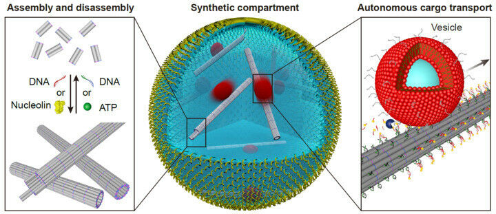 DNA-based mimicks of cytoskeletal filaments for reversible assembly and cargo transport. Photo: University of Stuttgart and Max-Planck-Institute for Medical Research - Introducing functional DNA-based cytoskeletons into cell-sized compartments - Publication Scientists from the 2. Physics Institute at the University of Stuttgart and the Max Planck Institute for Medical Research were now able to take the next step towards synthetic cells: They introduced functional DNA-based cytoskeletons into cell-sized compartments and showed functionality. The results were recently published. Building functional synthetic cells from the bottom-up is an ongoing effort of scientists around the globe. Their use in studying cellular mechanisms in a highly controlled and pre-defined setting creates great value for understanding nature as well as developing new therapeutic approaches. Scientists from the 2.