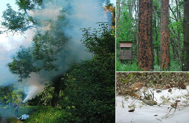 With the fogging method, insects and other invertebrates can be collected almost completely from tree crowns. All arthropods that are affected by the insecticide drop into the collecting sheets and are collected for identification. Top right: As a result of drought and ash dieback, most F. excelsior trees had died in 2020. Following a mass development of the ash bark beetle Hylesinus fraxini (Curculionidae, Scolytinae), woodpeckers subsequently destroyed the bark of dead F. excelsior trees. This gives the dead trunks their distinctive structure. (Image: Andreas Floren / Universität Würzburg)