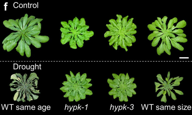 Heidelberg plant researchers identify key protein in a mechanism that controls the life of proteins. Representative phenotype of well-supplied (Control) and drought-stressed wild type (WT) plants and HYPK mutants. The drought stress was applied to approx. five-week-old plants for 24 days. Scale bar = 2 cm. Miklánková et al. Sci. Adv.