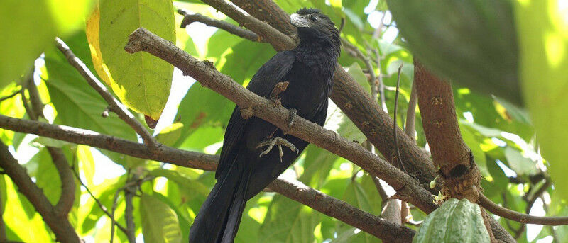 A bird found in cacao agroforests in Northern Peru, the groove billed ani. Birds, when occurring in cacao agroforests together with bats, ensured cacao yields in the study region. Their presence increased yield by 114%, compared to their absence.