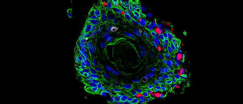 Image of patient-derived ectocervical stratified squamous organoids ( Green ) infected with Chlamydia trachomatis ( red ). (Image: AG Chumduri) 02/24/2022 - Infections with several pathogens simultaneously increase the risk of cervical cancer-these results from a study conducted on artificial 3D tissue models. Patients who develop cervical cancer are often infected not only with the human papillomavirus (HPV) but also simultaneously with the bacterial pathogen Chlamydia trachomatis . The suspicion is, therefore, that the two pathogens work together in a kind of team to "reprogram" the cells they infect in such a way that they degenerate and multiply uncontrollably. Dr. Cindrilla Chumduri, head of the research group, Department of Microbiology at the Julius Maximilians University of Würzburg (JMU) and her team, has now demonstrated for the first time that this is not just a suspicion but a concretely verifiable effect. They have developed lifelike organ replicas - so-called 3D organoids - on which they investigate the interactions between the pathogens and the tissues they affect and the disease processes. She has published the results of her research Communications.