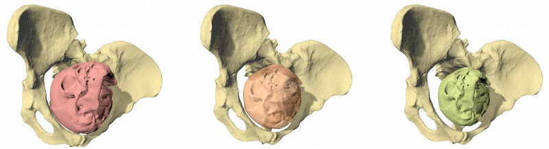 Birth simulation of Lucy (Australopithecus afarensis) with three different fetal head sizes. Only a brain size of maximum 30 percent of the adult size ( right ) fits through the birth canal. (Picture: Martin Häusler, UZH) - Childbirth in humans is much more complex and painful than in great apes. It was long believed that this was a result of humans- larger brains and the narrow dimensions of the mother's pelvis. Researchers at the University of Zurich have now used 3D simulations to show that childbirth was also a highly complex process in earlier hominin species that gave birth to relatively small-brained newborns - with important implications for their cognitive development. During human birth, the fetus typically navigates a tight, convoluted birth canal by flexing and rotating its head at various stages. This complex process comes with a high risk of birth complications, from prolonged labor to stillbirth or maternal death.
