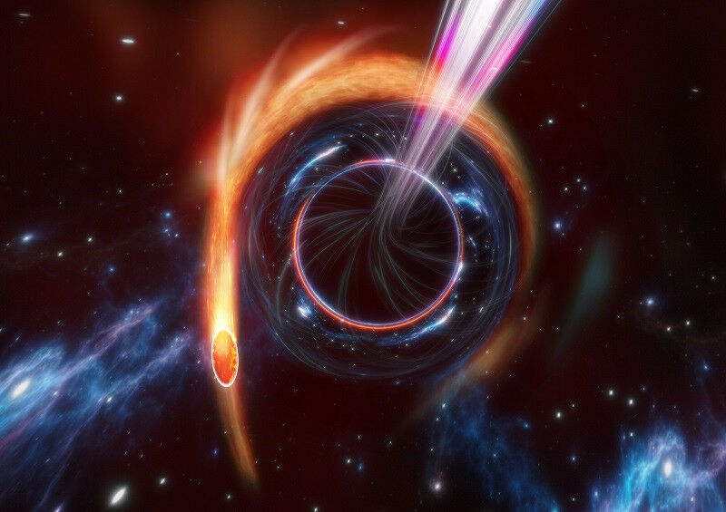 Image of AT2022cmc © Carl Knox - OzGrav, ARC Centre of Excellence for Gravitational Wave Discovery, Swinburne University of Technology - For the first time in over a decade, scientists from the CNRS and the Institut de radioastronomie millimétrique 1 , together with international colleagues, have observed a tidal disruption event (TDE) with jets, a very rare occurrence resulting from an encounter between a star and a supermassive black hole (SMBH). When such an event occurs, gravity disrupts the star: its matter breaks apart and spins quickly before being submerged by the black hole. Occasionally, the latter emits jets of matter travelling at slightly less than the speed of light. Such a rare emission, observed by the research teams and named AT2022cmc, is the subject of an article published on 30 November in the journal Nature. Researchers used methods developed since the last time a TDE was observed in 2012, including the Zwicky Transient Facility: a powerful camera coupled with special software that allows scientists to detect and signal unusual events in real time. Rapid coordination between the research teams, each of which is specialised in a specific form of observation, was key to viewing AT2022cmc. The NOEMA radio telescope 2 , for example, helped characterise the source of the event, and a spectrograph installed on the ESO Very Large Telescope was used to assess the origin of this rare phenomenon, estimated to be 8.5 billion light-years from Earth at the centre of its host galaxy.