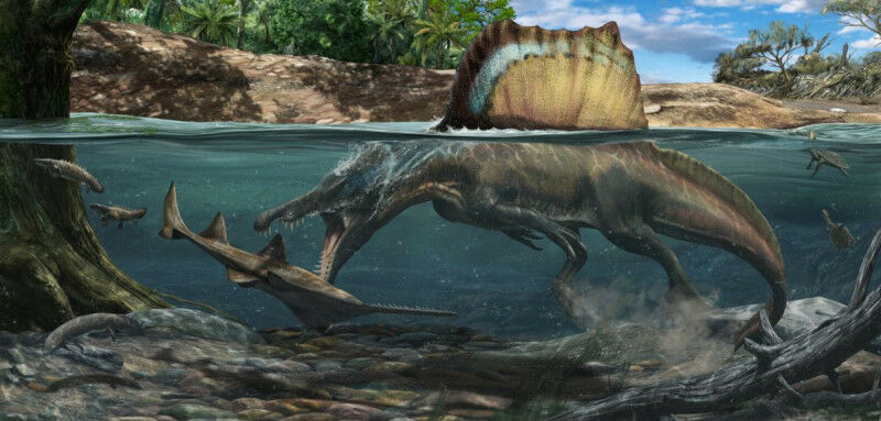 Illustration of the Spinosaurus Credit: Davide Bonadonna A new study published in Nature reveals that Spinosaurus, among the largest carnivorous dinosaurs ever discovered, could hunt underwater. New research by a multi-institution team including the Field Museum of Natural History, Chicago, the University of Oxford and the University of Cambridge used X-ray imaging of fossilised bones to analyse bone density. By comparing the bone structure of living animals and birds that forage in the water, researchers found strong evidence that dinosaurs from the spinosaurid family swam underwater to search for prey. Spinosaurid dinosaurs look like T. rex , but with a long, narrow snout and short legs. They include species like Spinosaurus from northern Africa, and Baryonyx from England, and were first discovered in 1915. Spinosaurus was similar in size to T. rex , weighing up to 7 tonnes, with a large crest-like sail across its back. Fossilised gut contents show that spinosaurids were amphibious hunters - eating both surf and turf - but it has been debated whether they caught fish in the water like a crocodile or hunted from the shallows like a heron.