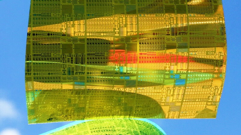 Flexible: Electronic circuits on a film of polyimide from the Empa laboratory form synaptic transistors. Image: Empa