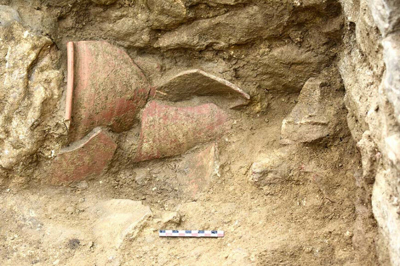 Rim fragments of the chamber pot in the course of being excavated. Credit: R. J. A. Wilson.