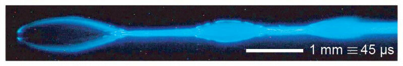 A flat-jet exhibiting blue luminescence due to the oxidation of Luminol. The photograph depicts the leaves formed through the crossing of two liquid microjets, flowing from left to right, and shows that the first leaf is characterised by laminar flow. As a consequence, a liquid-liquid interface is formed which can be used to measure chemical kinetics. Credit: A. Osterwalder (EPFL) - Scientists led by EPFL have developed a new method to measure chemical kinetics by imaging progress of a reaction at a liquid-liquid interface embedded in a laminar-flow liquid microjet. This method is ideal for studies of dynamics on the sub-millisecond timescale, which is very difficult to do with current applications. "It is a new application of so-called water flat-jets," says Andreas Osterwalder at EPFL's School of Basic Sciences. "We prepare a controlled interface between two aqueous solutions and use it to measure chemical kinetics." Free-flowing liquid microjets allow chemists to create a controllable smooth (and in some cases flat) surface of a liquid that can be used for surface scattering or spectroscopy studies.