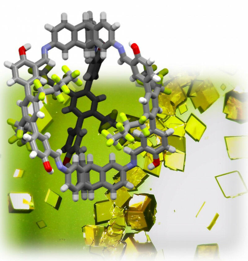 In the background: light microscopy images of the single-crystal structures of the shape-persistent organic cage compound. In the front: ball-and-stick model of the single-crystal structure, grey: carbon, white: hydrogen, red: oxygen, blue: nitrogen, green: fluorine. |