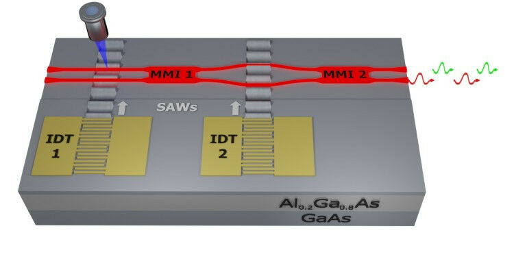 A focused laserbeam (left, blue ) generates single photos by a single quantum dot inside the photonic waveguides ( red ), which are fabricated on top of crystalline gallium arsenide- (GaAs-) aluminium gallium arsenide (Al0.2Ga0.8As).Two interdigitating electrodes (interdigital transducers, IDT) generate nanoscale soundwaves (surface acoustic waves, SAWs), which dynamically strain the waveguides. The nanoscale soundwave generated by the left IDT switches the color of the emitted single photons. The two waveguides are coupled by two so-called multimode interference beamsplitters (MMIs). The soundwave generated by the right IDT sorts the single photons according to their colour (red and green) between the two outputs on the right. Dominik Bühler A team of German and Spanish researchers from Valencia, Münster, Augsburg, Berlin and Munich have succeeded in controlling individual light quanta to an extremely high degree of precision. In the "Nature Communications" journal, the researchers report how, by means of a soundwave, they switch individual photons on a chip back and forth between two outputs at gigahertz frequencies. This method, demonstrated here for the first time, can now be used for acoustic quantum technologies or complex integrated photonic networks.