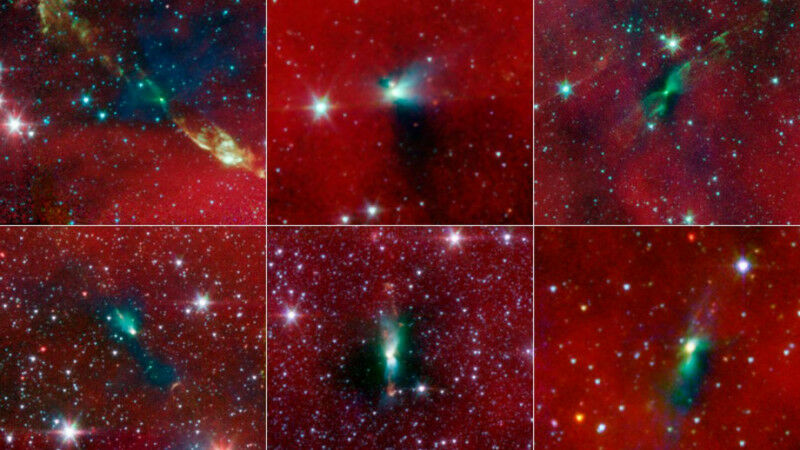 This is one of six images taken by NASA Spitzer Space Telescope, showing that tight-knit twin, or binary stars might be triggered to form by asymmetrical envelopes. Secondary Creator Credit: NASA/JPL-Caltech/Univ. of Michigan.