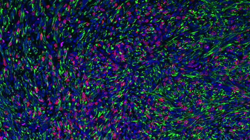 Tumor with FMRP-deficient cancer cells (in green) being infiltrated and attached by killer (CD8) T cells. Credit: Jeremy Guillot (Hanahan Lab - EPFL).