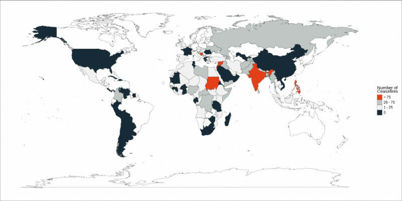 Regional distribution of ceasefires in the new dataset. (Illustration: Clayton et al. The path to peace usually leads through a ceasefire. In an international project, researchers have shown the conditions under which parties to civil wars are willing to stop fighting - and why they decide to do so. Abstract. Between 1989 and 2020, a total of 2202 ceasefires resulted from 109 civil wars in 66 countries. During particularly bloody months, conflict parties are more likely to agree to ceasefires.