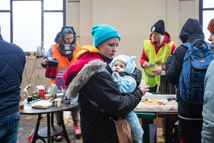 Ukrainian refugees on Lviv railway station waiting for train to escape to Europe