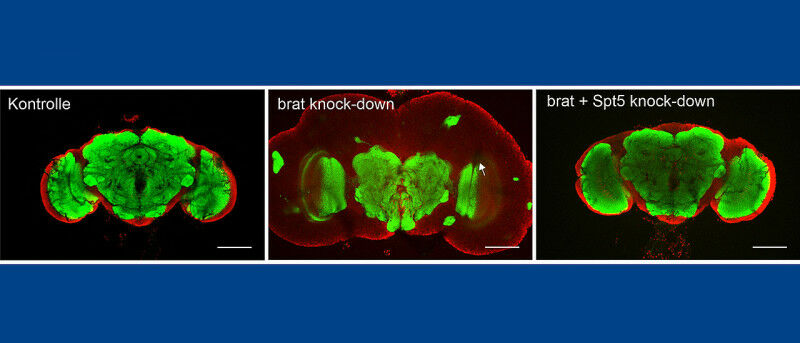 Brains of three-day-old adult flies. Left: Healthy specimens. Center: animals with a brain tumor. Right: Brain tumor after reduction of SPT5 levels. Green coloring shows central brain regions. Red coloring shows the cerebral cortex, which is strongly expanded by the tumor. (Image: AG Raabe) MYC proteins play an important role in many types of cancer.