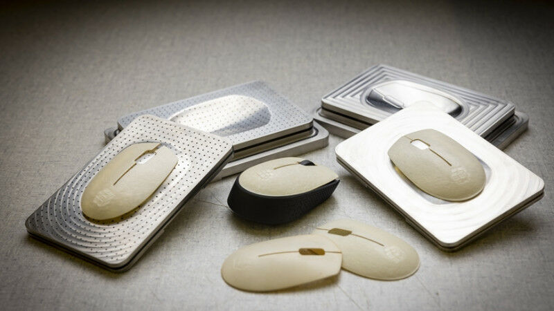 Empa scientist Thomas Geiger has produced housing parts for computer mice from cellulose fibers on a trial basis. The surfaces shine like precious ivory; the components are completely compostable. Image: Empa