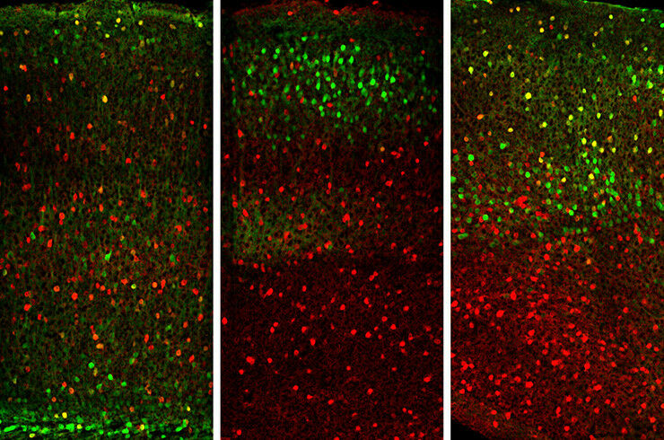 FMI researchers mapped specific populations of neurons ( green ) that turn on in the brain's outer layer when mice experience a mismatch between expectations and reality. Inhibitory neurons are shown in red. Image credits: Sean O'Toole/FMI. When our expectations differ from reality, specific sets of brain cells are activated. Working in mice, FMI researchers have characterized these neurons based on their gene-expression patterns, paving the way for a better understanding of some of the neuronal deficits associated with neuropsychiatric conditions. Anyone who has ever opened a Danish butter cookie tin only to find a sewing kit knows it: we often face a mismatch between our expectations and reality. When this happens, specific sets of neurons located in the cortex — the brain's outer layer — turn on.